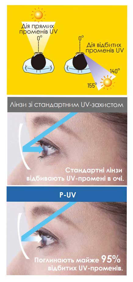 - P-UV — дополнительная защита от ультрафиолетового света, который может отражаться от внутренней стороны линзы. До 95% отражённого УФ-излучения нейтрализуется.