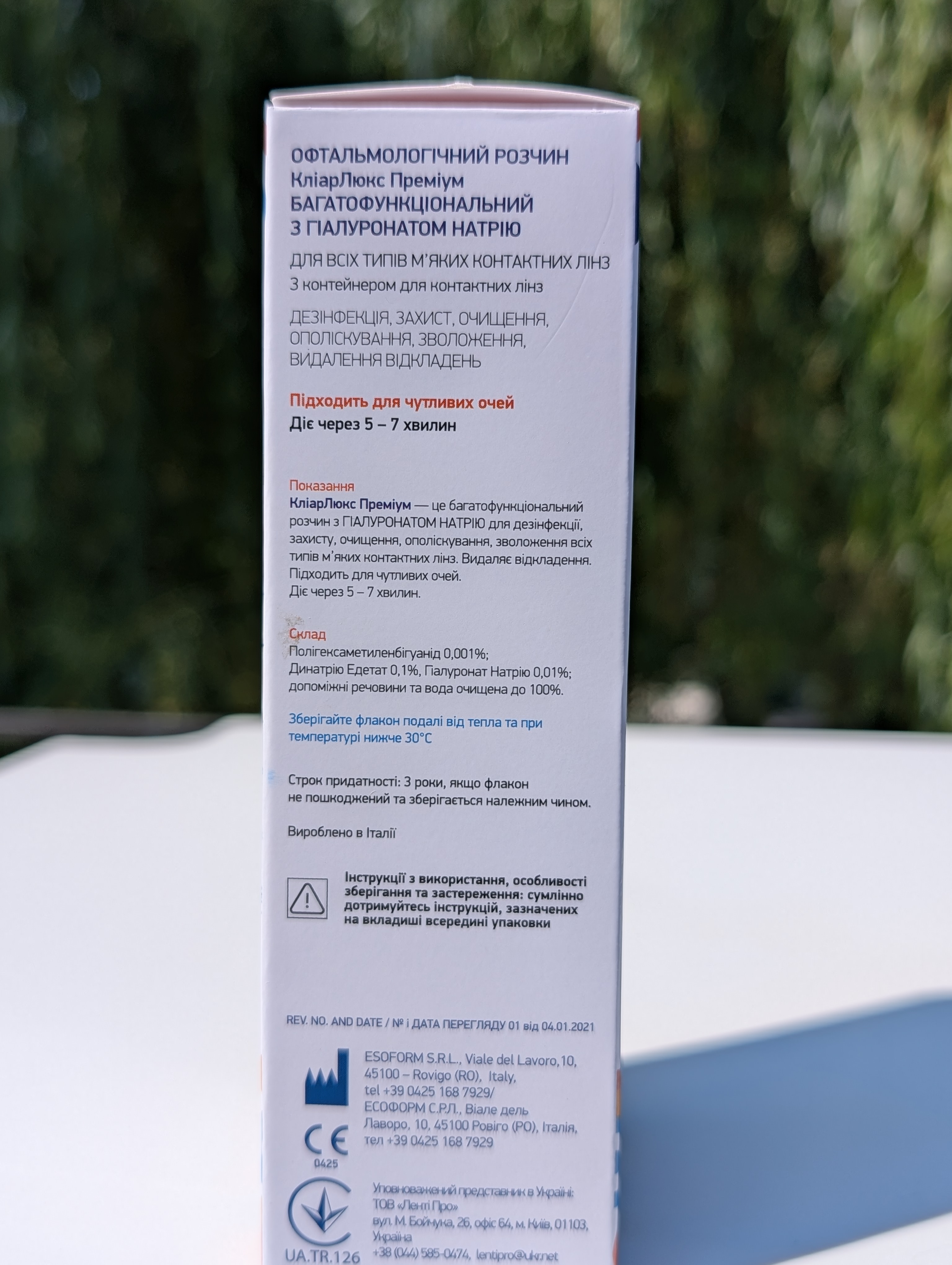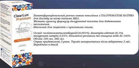PHMBG – 0,0001%, Pluronic F127 – 1,00%, динатрієва сіль ЕДТА – 0,10%, хлорид натрію, борна кислота, тетраборат натрію декагідрат, полі кватерніум 2, PVP, гіалуронат натрію – 0,01% та очищена вода до 100%.Купити ClearLux Premium