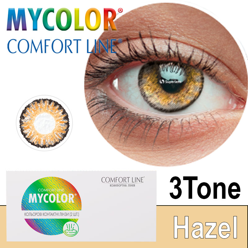 Замовити кольорові контактні лінзи МайКолор Трі Тон Хейзел від Comfort Line від Interojo з насиченим тритоновим горіховим кольором можна онлайн на сайті superlens. Доставка лінз: з доставкою кур'єрською службою «Нова пошта» у Дніпро, Київ, Одеса, Кривий Ріг, Миколаїв та Вінницю на вказане відділення.