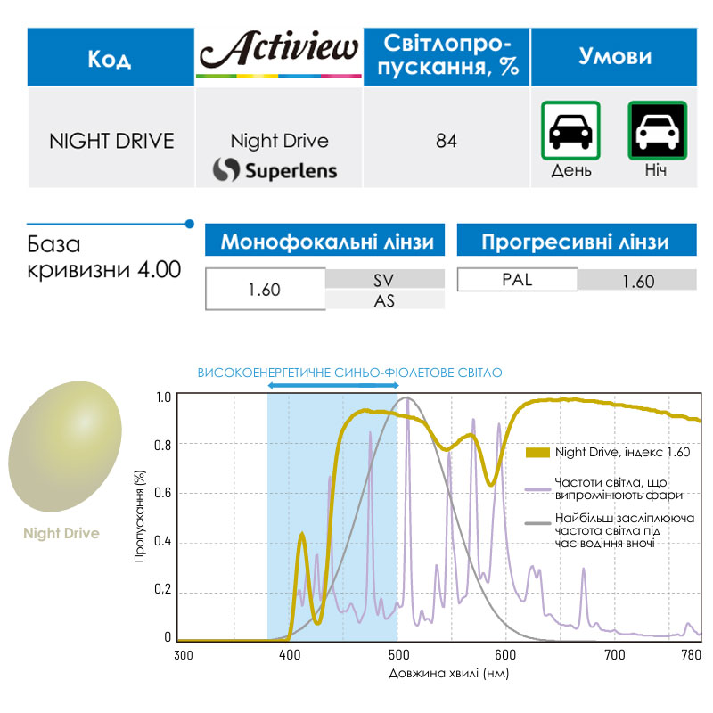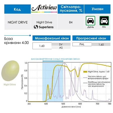 NightDrive: блокують найбільш сліпучу частину світла зустрічного транспорту 510 Нм Покриття: покриття з твердим антирефлексним та гідрофобним, антистатичним шарами